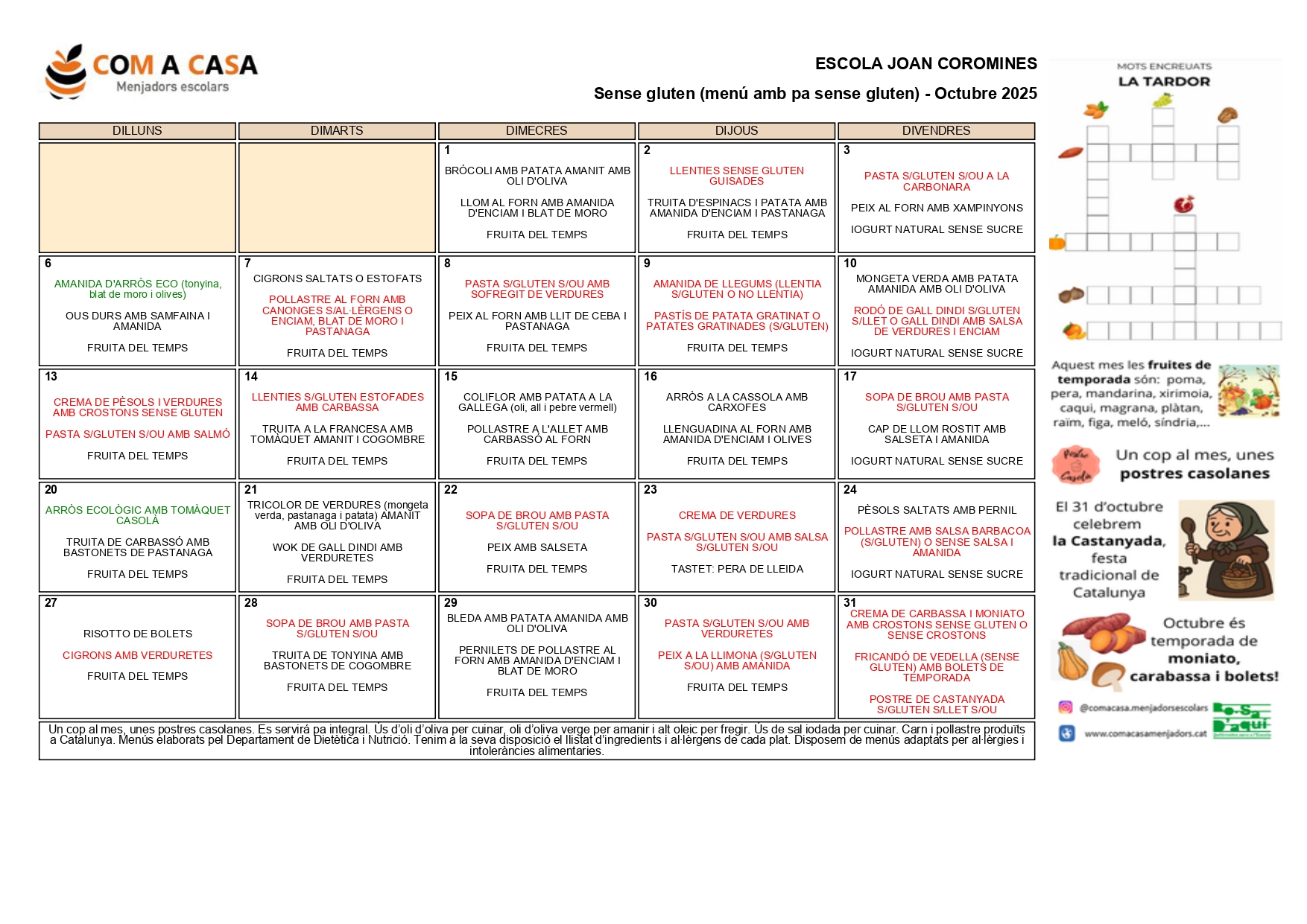 Menú Sense gluten (amb pa sense gluten)