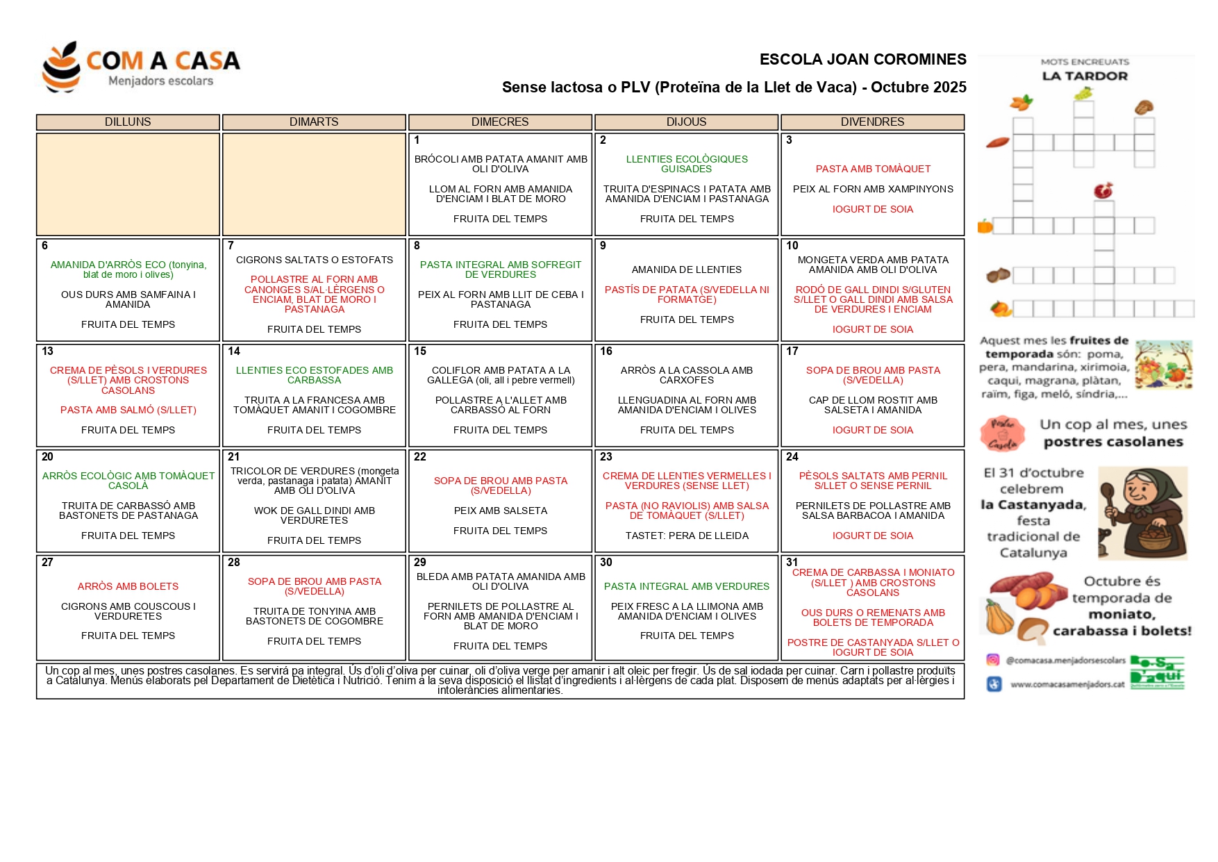 Menú Sense lactosa o PLV (Proteïna de la llet de vaca)